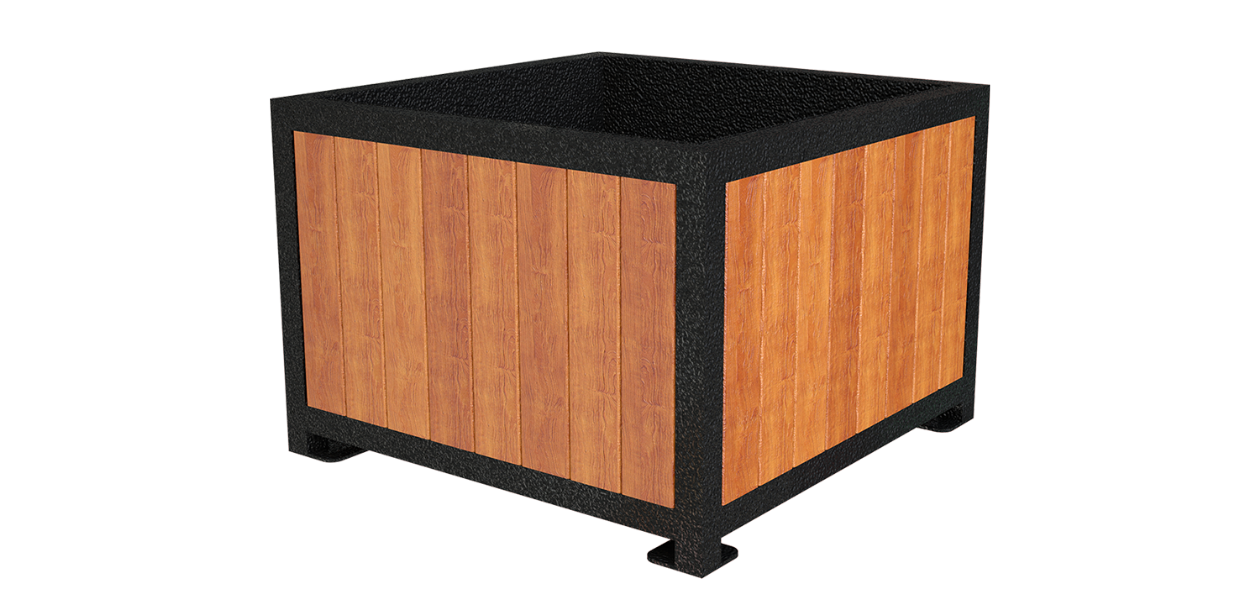 Maceta fabricada en estructura de PTR de acero con acabado en pintura electrostática. Vista de madera tropical para exteriores dándole mayor durabilidad al producto.