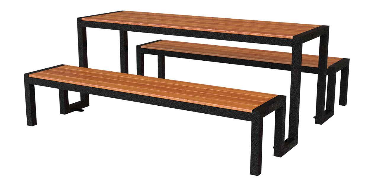 Mesa picnic fabricada en estructura de PTR de acero con acabado en pintura electrostática. Asiento y mesa de madera tropical para exteriores dándole mayor durabilidad al producto.
