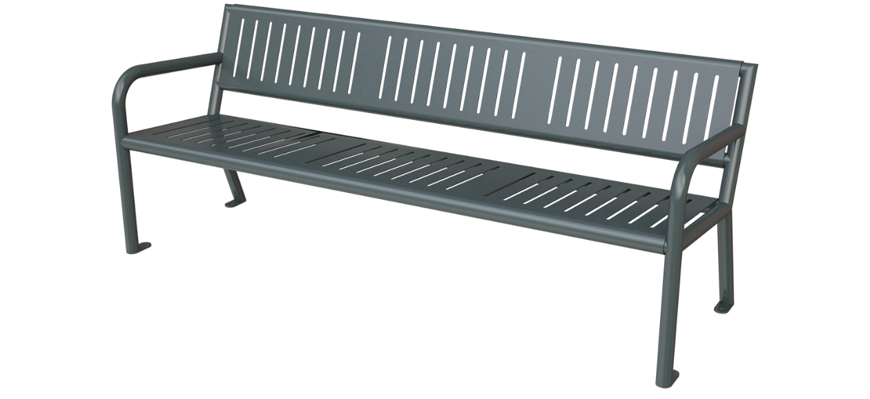 Banca con respaldo fabricada en estructura tubular con asiento y respaldo en lámina de acero con acabado en pintura electrostática dándole mayor durabilidad.